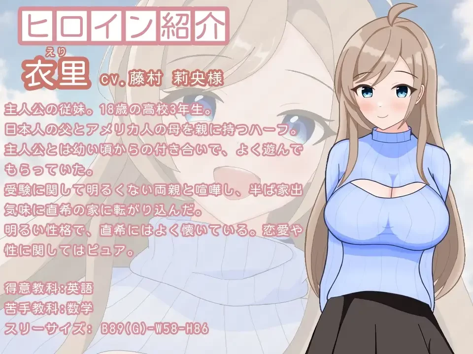 某个夏夜,高中三年级的表妹衣里(绘里饰)突然闯入独居的社会人主人公直希(玩家饰)的身边。
